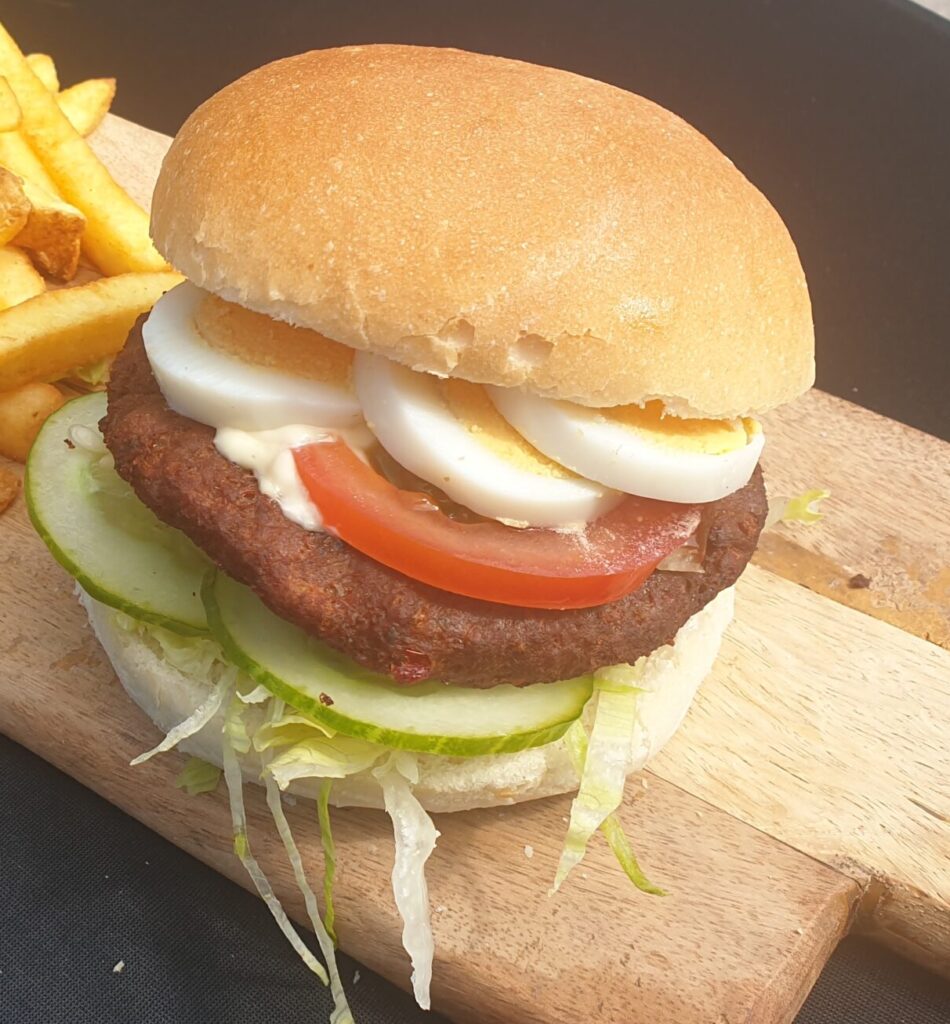 Br. Hamburger Extra Speciaal: Heerlijke hamburger met stukjes groente, op een wit kadetje. Rijk belegd met verse ijsbergsla, komkommer, speciaal-saus, tomaat, ei.