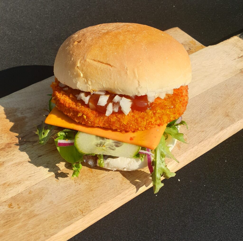 Br. Kipburger Extra Speciaal: Kipburger van mals kipfilet, wit kadetje, rucola, rode ui, komkommer, pittige-cheddar, speciaal-saus; of jou saus naar keuze!